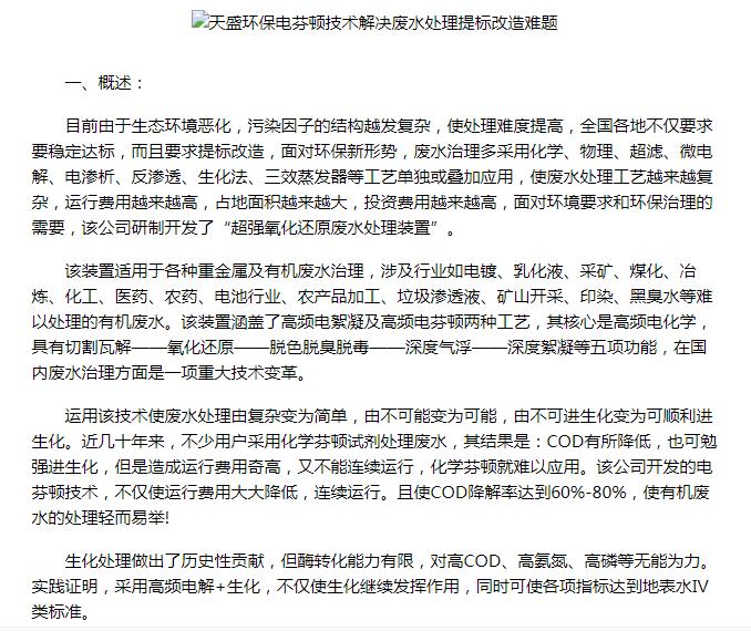 亞洲在線刊登:天盛環(huán)保電芬頓技術解決廢水處理提標改造難題